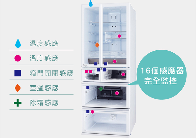 三菱電機電冰箱,搭配廣佈各庫室的16個感應器,精準控制庫室溫度。