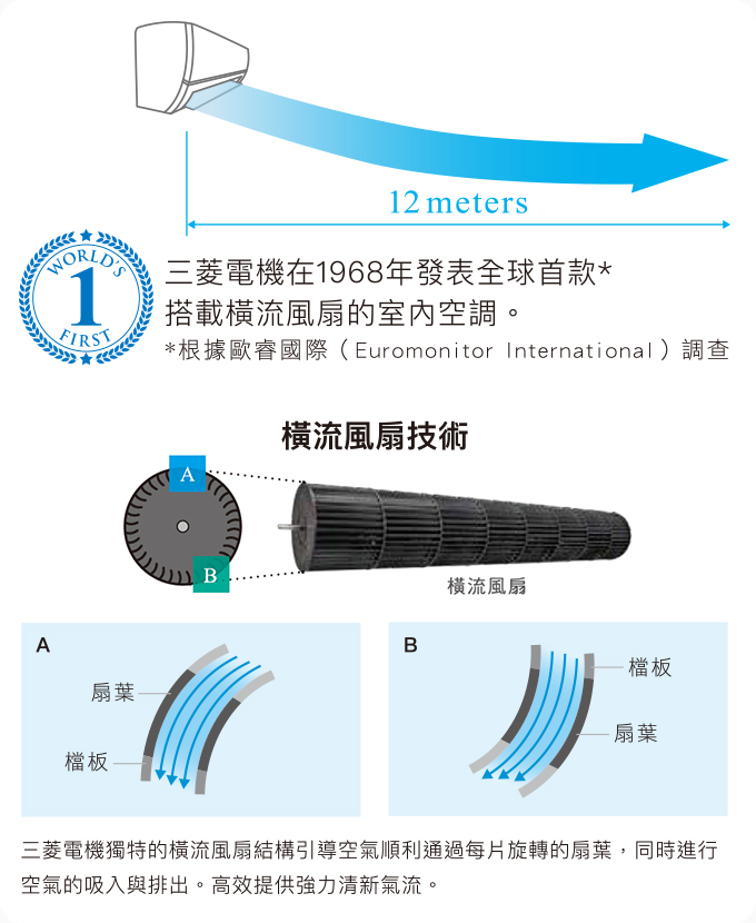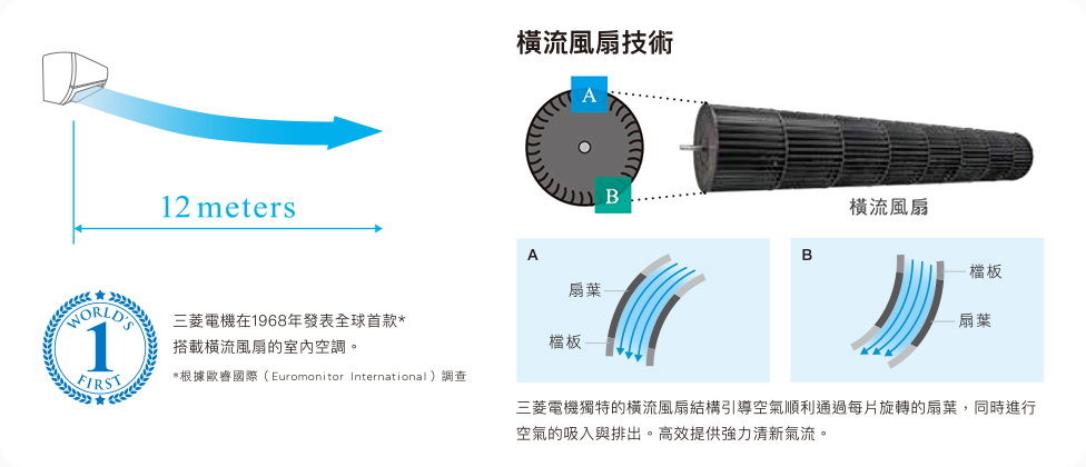 ▲三菱電機採用獨特的橫流風扇設計,長距離送風