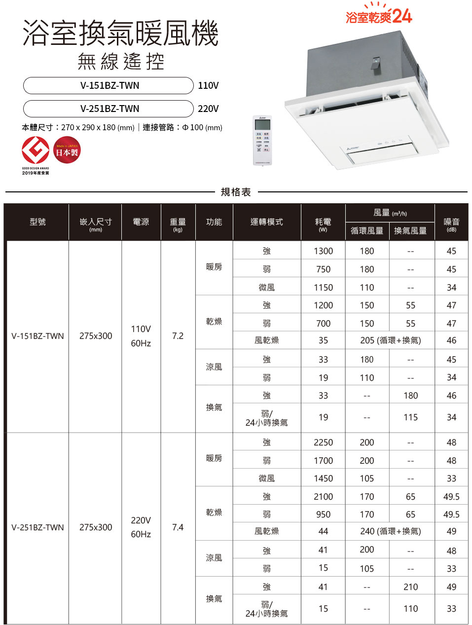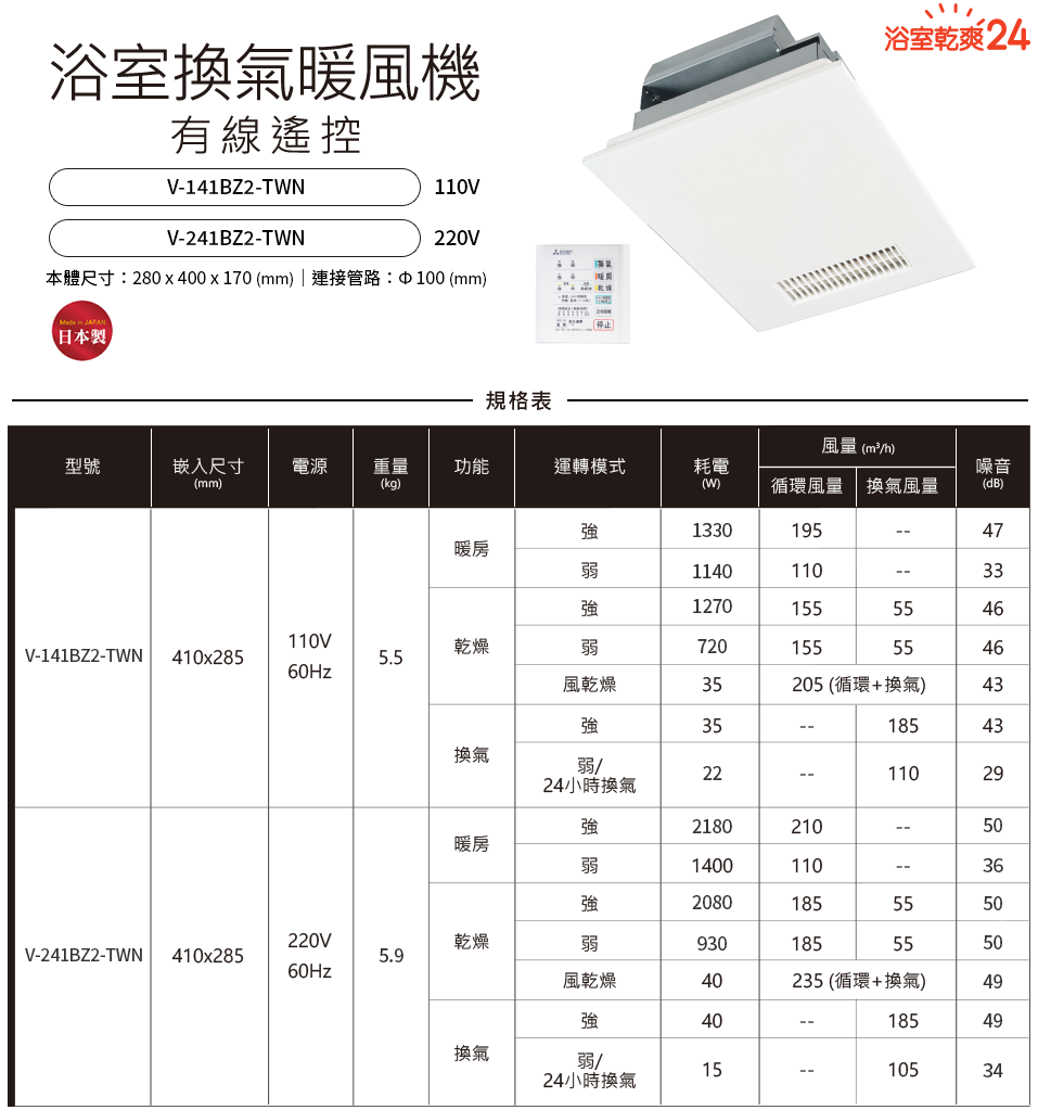 ※本產品附有24小時換氣運轉功能。(以換氣功能「弱」風量運轉)