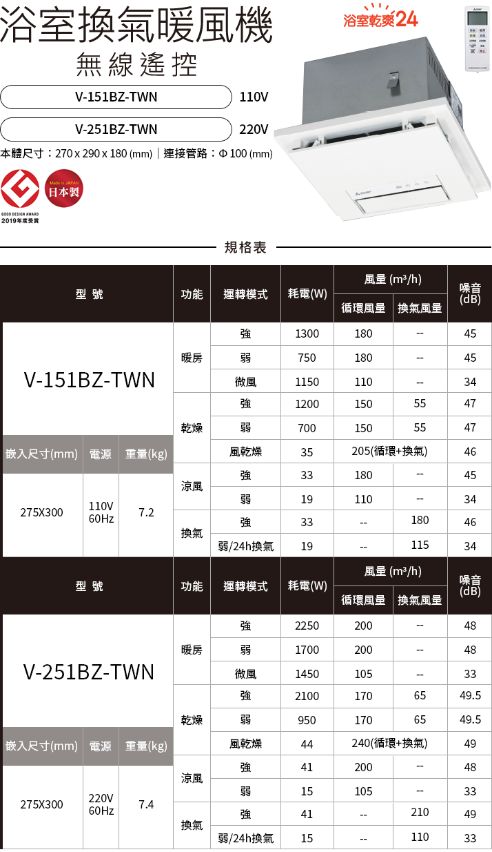 ※耗電量是依據JIS C 9603,風量與噪音是依據JEM 1386標準測量。